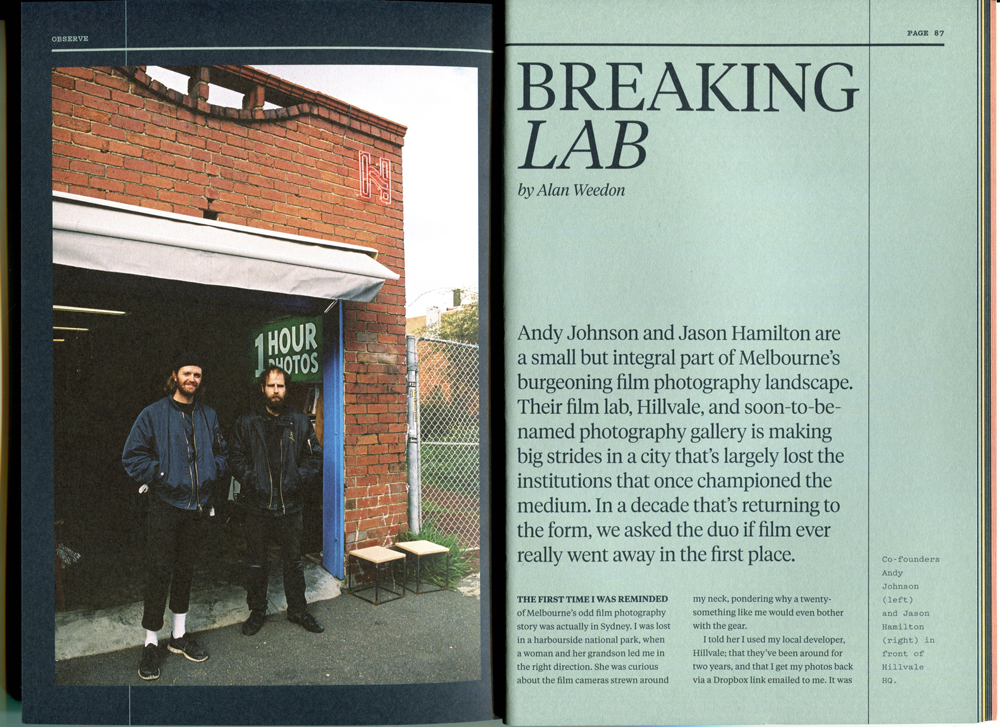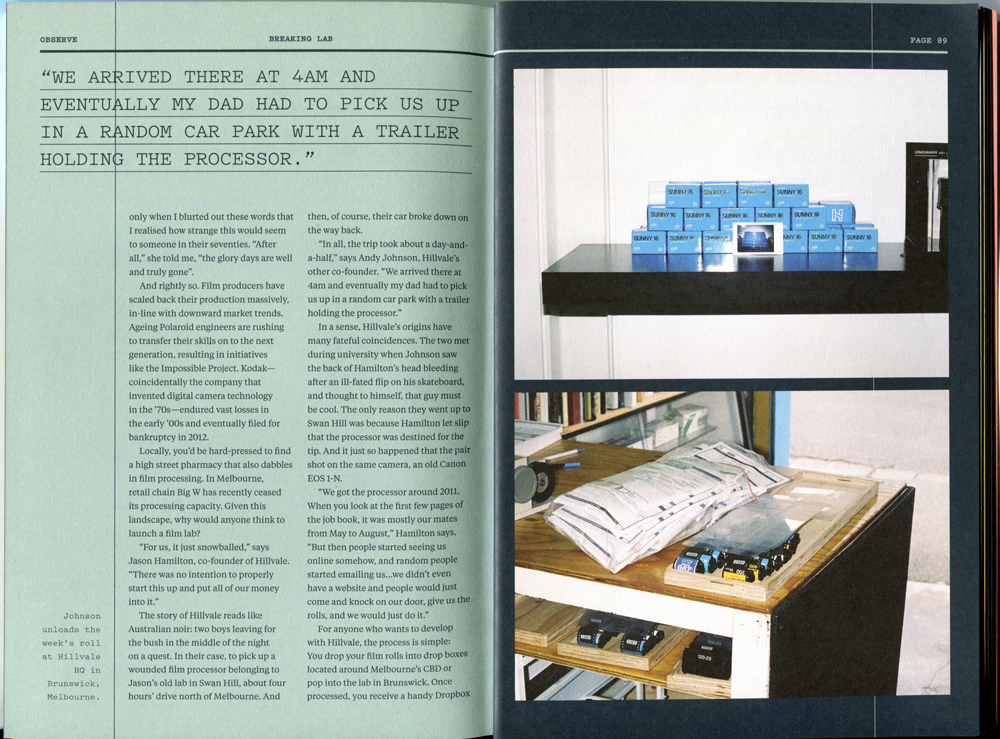 'Breaking Lab' is a written and photographic profile I penned for the magazine, Men In This Town, profiling the work of Hillvale, an independent film processing lab in Brunswick, Australia.
